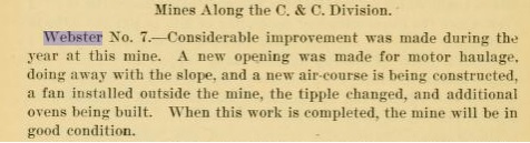 1900-1901 shows the mine has been renamed Webster No. 7 by the Webster Coal and Coke Company with 20 ovens. This is important because throughout the rest of its existence, this will always be the Number 7 Mine.